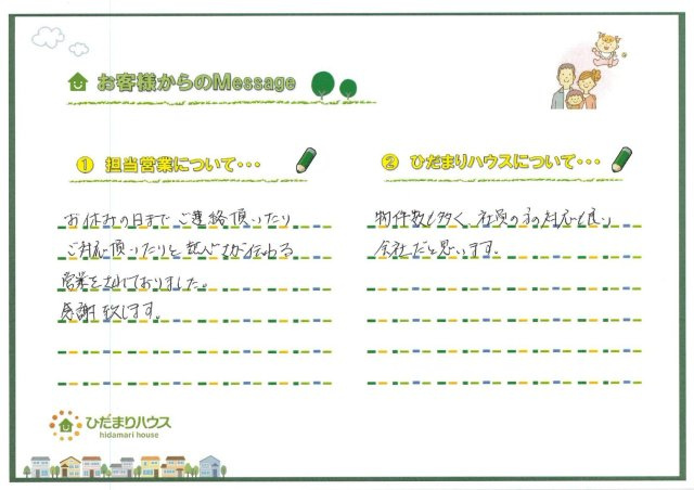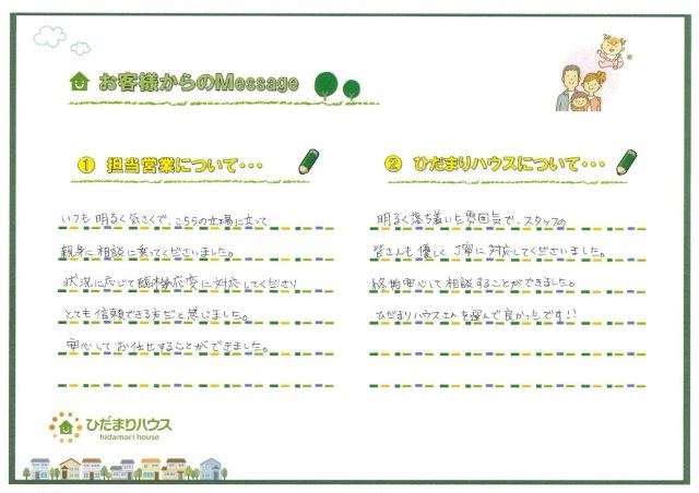 家を購入するにあたり数多くの営業の方とお会いしてきましたが、今回担当してくださった川上さんは業界経験こそ少ないというお話でしたが、この先もお付き合いをしてゆく方と思うと、必要なのは口先の営業ではなく、心があるかどうかに思われます。その点において買うならひだまりさんからと思えたのでとても感謝しております。